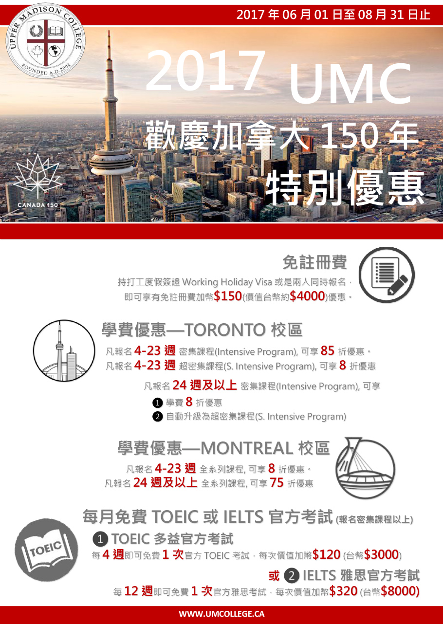 2017年加拿大知名語言學校UMC為了歡慶加拿大150週年,特別是出全新優惠,只到2017/8/31為止!無論是蒙特婁校區或是多倫多校區,都推出了非常省荷包的遊學優惠,持有打工度假簽證者還額外享有優惠,歡迎跟達仁留遊學洽詢所有的優惠方案!