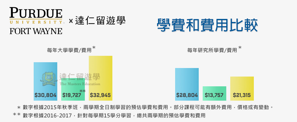 - 國際生學費(不含住宿&雜費):$19,727美元/大學部,$13,757美元/研究所(費用或有變動請洽詢達仁)