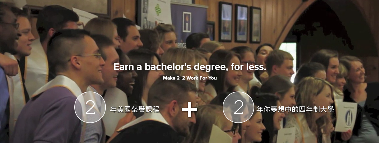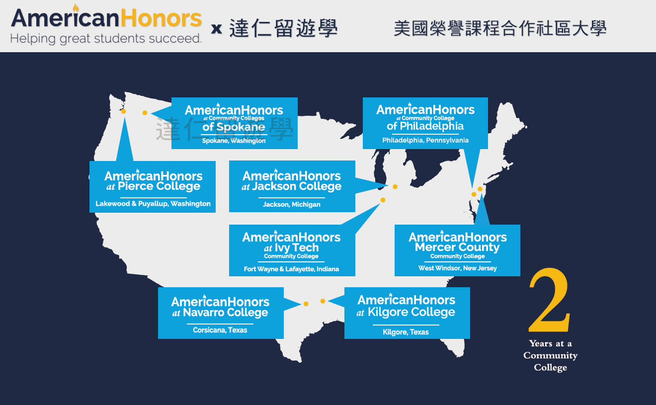 相較於頂尖4年制名校昂貴的學費,美國榮譽課程(AmericanHonors)在全美1200多所社區大學中,精選了八所精選優秀社區大學合作(合作社區大學請見本文末圖),以2+2模式(2年社區大學後轉學到4年制大學並直接從大三開始就讀),讓學生前兩年能以50%的費用,獲得比一般社區大學課程更高階的大學一、二年級資優班課程。凡是修讀美國榮譽課程的科目,成績單上也會清楚載明Honors Course字樣,這對將來轉讀四年制大學的申請將有莫大幫助。