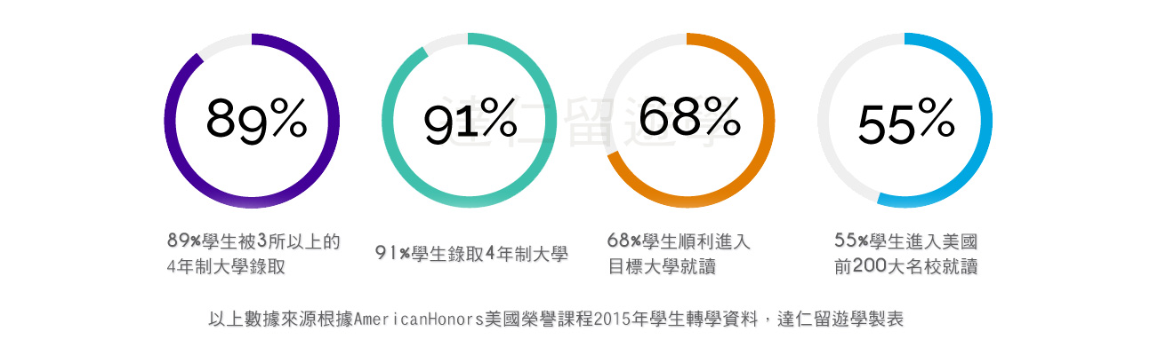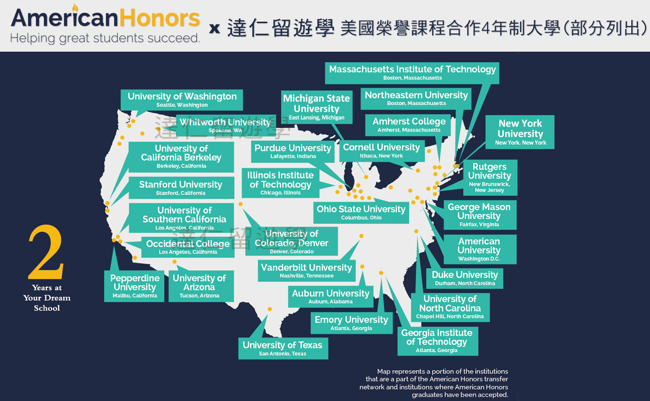 - 龐大的轉學網絡和可靠的錄取途徑,AmericanHonors美國榮譽課程賦予你更多被頂尖名校錄取的可能性。包含保證錄取名校:普渡大學、美利堅大學、密西根州立大學等,優先錄取名校如:麻省理工學院、康乃爾大學等。